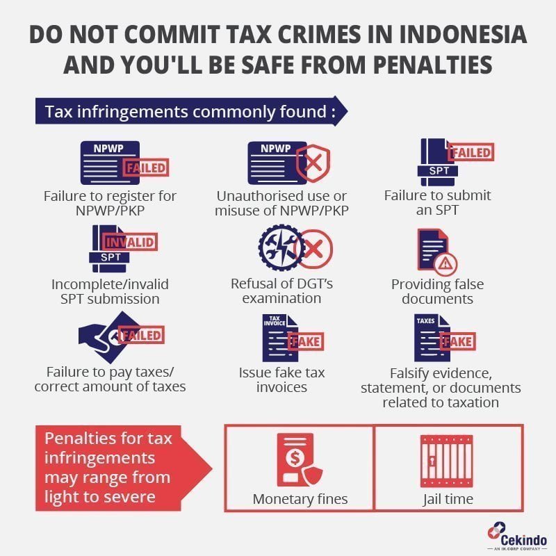 Home Blog Common Tax Infringements in Indonesia and How to Avoid Them Uncategorized Common Tax Infringements in Indonesia and How to Avoid Them InCorp Editorial Team 3 March 2020 4 minutes reading time Table of Contents Law Governing Tax Compliance in Indonesia Common Tax Infringements in Indonesia Penalties for Tax Infringements in Indonesia Ensure Tax Compliance through Outsourcing to Cekindo Over the years, we have seen an immense flourish of businesses in Indonesia. Therefore, the legal requirements to keep up legitimate accounting and tax filing are also getting more and more significant. However, due to the ever-changing laws and the complexity of the regulations, most business owners and foreign entrepreneurs often find tax filing, reporting and other tax-related processes to be daunting and exhausting. As a result, they have been struggling to get it right when it comes to tax compliance in Indonesia. In Indonesia, taxation laws and regulations are created and governed by the Ministry of Finance and Director General of Tax (DGT). It is obligatory for all companies in Indonesia to comply with the lawful taxation requirements to thrive and to compete with other businesses. Tax and accounting outsourcing services offered by professional tax consultants could be businesses’ rescuer for tax compliance and tax crimes avoidance. Law Governing Tax Compliance in Indonesia Article 23A of the 1945 Indonesian Constitution serves as the principal taxation law and regulation in Indonesia. According to Article 23A, taxes in the form of contribution are mandatory for all Indonesian nationals, foreigners and the country’s residents who have stayed in Indonesia for at least 183 days within a consecutive 12-month period. A person is not considered a tax resident if he/she has resided in Indonesia for fewer than 183 days over a 12-month period. In this case, he/she does not have to pay for taxes of income generated outside of Indonesia; he/she only has to pay for taxes of income generated in Indonesia. Common Tax Infringements in Indonesia A business or an individual can easily commit a tax crime if a tax regulation is violated. Common tax crimes or tax infringements in Indonesia include the following: Failure to register for Taxpayer Identification Number (NPWP) Failure to to register a business as taxable entrepreneur (PKP) Unauthorised use or misuse of NPWP or PKP Failure to submit an SPT Submit an SPT with invalid or incomplete information Refusal of DGT’s examination Provide false documents that do not reflect the current circumstances Failure to pay taxes or the correct amount of taxes Issue a fake tax invoice Falsify evidence, statement, or documents related to taxation Penalties for Tax Infringements in Indonesia The penalties of a person or a business committing a tax crime in Indonesia vary based on the type of the tax infringement. For instance, if a corporation fails to submit an SPT, a fine of IDR 1,000,000 awaits. For an individual, the fine is IDR 100,000. For a more serious tax infringement like an unauthorised use or misuse of PKP or NPWP, tax offenders can be jailed at least six months or up to two years. In addition to imprisonment, huge monetary fines will be imposed on tax offenders. More serious tax crimes can lead to an increased jail time of up to six years; or even double the time if the tax offender ever committed a tax crime as well in the past year. Ensure Tax Compliance through Outsourcing to Cekindo Cekindo understands that every company in Indonesia is always in search of ways to boost their business performance, and cut their spendings and costs. Most importantly, they want to ensure tax compliance in Indonesia to prevent unnecessary tax crimes or tax infringements. Therefore, we provide flexible and effective tax and accounting outsourcing services all across Indonesia. In this ever-increasing competitive market, it is hard for businesses to handle all their business processes internally especially when it comes to taxes, finance and other accounting processes. Thus, by outsourcing to Cekindo, you can keep your finances up to date and your accounting work ahead of your competitors. What’s more, you will be able to reduce your overheads and get immediate updates on your outsourced processes to ensure compliance in Indonesia. Outsource to Cekindo now and outperform others. Fill in the form below. Read Full Bio Verified by Ales Cina Consulting Manager at InCorp Indonesia Aleš manages solution delivery at InCorp Indonesia, optimizing incorporation processes and client relationships. His experience in internal auditing, retail, and sales offers valuable global insights. Aleš, with a degree in... Read more Get in touch with us. Lead Form Contact Full NameEmailPlease provide corporate email where possiblePhone NumberOffice SetupWhich city are you planning to expand into?JakartaSemarang/Central JavaBali/LombokBatam/SumateraSurabaya/East JavaOther ProvincesType of Service- Please Select -[SPECIAL PACKAGE] Company Registration + Office Package (20% OFF)[SPECIAL PACKAGE] Product Registration + License Holder (20% OFF)[SPECIAL PACKAGE] EOR + Recruitment (15% OFF)Business SetupAccounting and TaxHR & Payroll servicesImmigration ServicesProduct Registration and ImportCompliance and Secretarial ServicesBusiness AdvisoryMore ServicesType of Service- Please Select -[SPECIAL PACKAGE] Company Registration + Office Service (20% OFF)[SPECIAL PACKAGE] Comprehensive Industrial Package (15% OFF)[SPECIAL PACKAGE] EOR + Recruitment (15% OFF)Business SetupAccounting and TaxHR & Payroll servicesImmigration ServicesProduct Registration and ImportCompliance and Secretarial ServicesBusiness AdvisoryMore ServicesType of Service- Please Select -[SPECIAL PACKAGE] Company Registration & Tax Services (15% OFF)[SPECIAL PACKAGE] Company Registration + FTZ (15% OFF)[SPECIAL PACKAGE] EOR + Recruitment (15% OFF)Business SetupAccounting and TaxHR & Payroll servicesImmigration ServicesProduct Registr