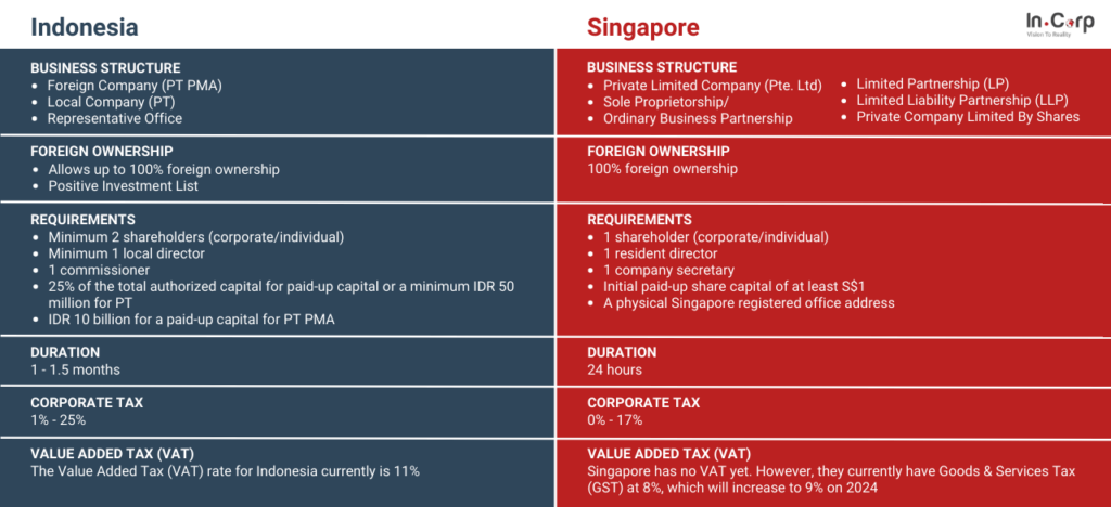Home Blog Company Incorporation: Indonesia vs. Singapore Company Incorporation: Indonesia vs. Singapore InCorp Editorial Team 9 November 2023 1 minutes reading time Table of Contents Indonesia and Singapore offer tremendous potential for doing business in the Southeast Asia region. Both countries offer diverse opportunities and potentials for investors to develop their businesses in two varied markets. As one of your reference materials, we have summarized the comparison of information you need to know about company incorporation in Indonesia and Singapore in the following infographic. You can also check other information related to this topic in this article A Comparison between Company Incorporation in Indonesia and Singapore, or drop a message through the form below for further discussion with our consultants. Read Full Bio Verified by Ales Cina Consulting Manager at InCorp Indonesia Aleš manages solution delivery at InCorp Indonesia, optimizing incorporation processes and client relationships. His experience in internal auditing, retail, and sales offers valuable global insights. Aleš, with a degree in... Read more Get in touch with us. Lead Form Contact Full NameEmailPlease provide corporate email where possiblePhone NumberOffice SetupWhich city are you planning to expand into?JakartaSemarang/Central JavaBali/LombokBatam/SumateraSurabaya/East JavaOther ProvincesType of Service- Please Select -[SPECIAL PACKAGE] Company Registration + Office Package (20% OFF)[SPECIAL PACKAGE] Product Registration + License Holder (20% OFF)[SPECIAL PACKAGE] EOR + Recruitment (15% OFF)Business SetupAccounting and TaxHR & Payroll servicesImmigration ServicesProduct Registration and ImportCompliance and Secretarial ServicesBusiness AdvisoryMore ServicesType of Service- Please Select -[SPECIAL PACKAGE] Company Registration + Office Service (20% OFF)[SPECIAL PACKAGE] Comprehensive Industrial Package (15% OFF)[SPECIAL PACKAGE] EOR + Recruitment (15% OFF)Business SetupAccounting and TaxHR & Payroll servicesImmigration ServicesProduct Registration and ImportCompliance and Secretarial ServicesBusiness AdvisoryMore ServicesType of Service- Please Select -[SPECIAL PACKAGE] Company Registration & Tax Services (15% OFF)[SPECIAL PACKAGE] Company Registration + FTZ (15% OFF)[SPECIAL PACKAGE] EOR + Recruitment (15% OFF)Business SetupAccounting and TaxHR & Payroll servicesImmigration ServicesProduct Registration and ImportCompliance and Secretarial ServicesBusiness AdvisoryMore ServicesType of Service- Please Select -[SPECIAL PACKAGE] Company Registration (25% OFF) + Office Space (Private Office 30% OFF)[SPECIAL PACKAGE] Company Registration + Investor KITAS (25% OFF)[SPECIAL PACKAGE] Accounting + Tax Services+ Annual Fintax Report (20% OFF)[SPECIAL PACKAGE] Payroll Services for Executive Role (20% OFF)[SPECIAL PACKAGE] EOR + Recruitment (15% OFF)Business SetupAccounting and TaxHR & Payroll servicesImmigration ServicesProduct Registration and ImportCompliance and Secretarial ServicesBusiness AdvisoryMore ServicesType of Service- Please Select -[SPECIAL PACKAGE] Company Registration (20% OFF) + Office Service (25% OFF)[SPECIAL PACKAGE] Company Registration + Micro Finance Services (25% OFF)[SPECIAL PACKAGE] Property Assistance: Due Diligence + AJB Purchase/Lease Agreement (25% OFF)[SPECIAL PACKAGE] EOR + Recruitment (15% OFF)Business SetupAccounting and TaxHR & Payroll servicesImmigration ServicesProduct Registration and ImportCompliance and Secretarial ServicesBusiness AdvisoryMore ServicesType of Service- Please Select -[SPECIAL PACKAGE] EOR + Recruitment (15% OFF)Business SetupAccounting and TaxHR & Payroll servicesImmigration ServicesProduct Registration and ImportCompliance and Secretarial ServicesBusiness AdvisoryMore ServicesServices Company Registration Renting Virtual and Serviced Office Business and Import Licenses Corporate Recovery and Insolvency Closing of Company (Dissolution) Land and Property Ownership Shelf Company Local NomineeServices Accounting and Tax Reporting Audit and Review Transfer Pricing Compliance Tax RefundHuman Resource Sub Services Payroll Outsourcing Employer of Record Recruitment and HR Establishment Employment ServiceServices Business Visa Work Permit and KITAS Dependent Visa (Spouse and Family) Stay Permit (KITAP) Investor KITAS Tourist Visa Overseas Visa OtherBusiness Visa Subservices Business Visa Visit Visa Visa ExtensionServices Medical Device Beauty (Skincare and Cosmetic) Food and Beverage Health Supplement Household Product Halal Certification Trademark SNI RegistrationServices Legal Consultation Legal Agreement Service Due Diligence and Background Check Company Documents RevisionBusiness Advisory Business Advisory Services ESG Reporting & Advisory Internal Audit Risk ManagementMore Services Market Research and Analysis Local Distributor and Partner Bank AccountWhat country's passport do you hold?What kind of products do you need to register for SNI?MessageHow did you hear about InCorp Indonesia?- Please Select -Google SearchSocial Media (Instagram, LinkedIn, etc.)Friend / Colleague ReferralAttended an Event / WebinarOther (please specify)Other (please describe)Submit What you’ll get A prompt response to your inquiry Knowledge for doing business from local experts Ongoing support for your business Disclaimer The information is provided by PT. Cekindo Business International (“InCorp Indonesia/ we”) for general purpose only and we make no representations or warranties of any kind. We do not act as an authorized government or non-government provider for official documents and services, which is issued by the Government of the Republic of Indonesia or its appointed officials. We do not promote any official government document or services of the Government of the Republic of Indonesia, including but not limited to, business identifiers, health and welfare assistance programs and benefits, unclaimed tax rebate, electronic travel visa and authorization, passports in this websi