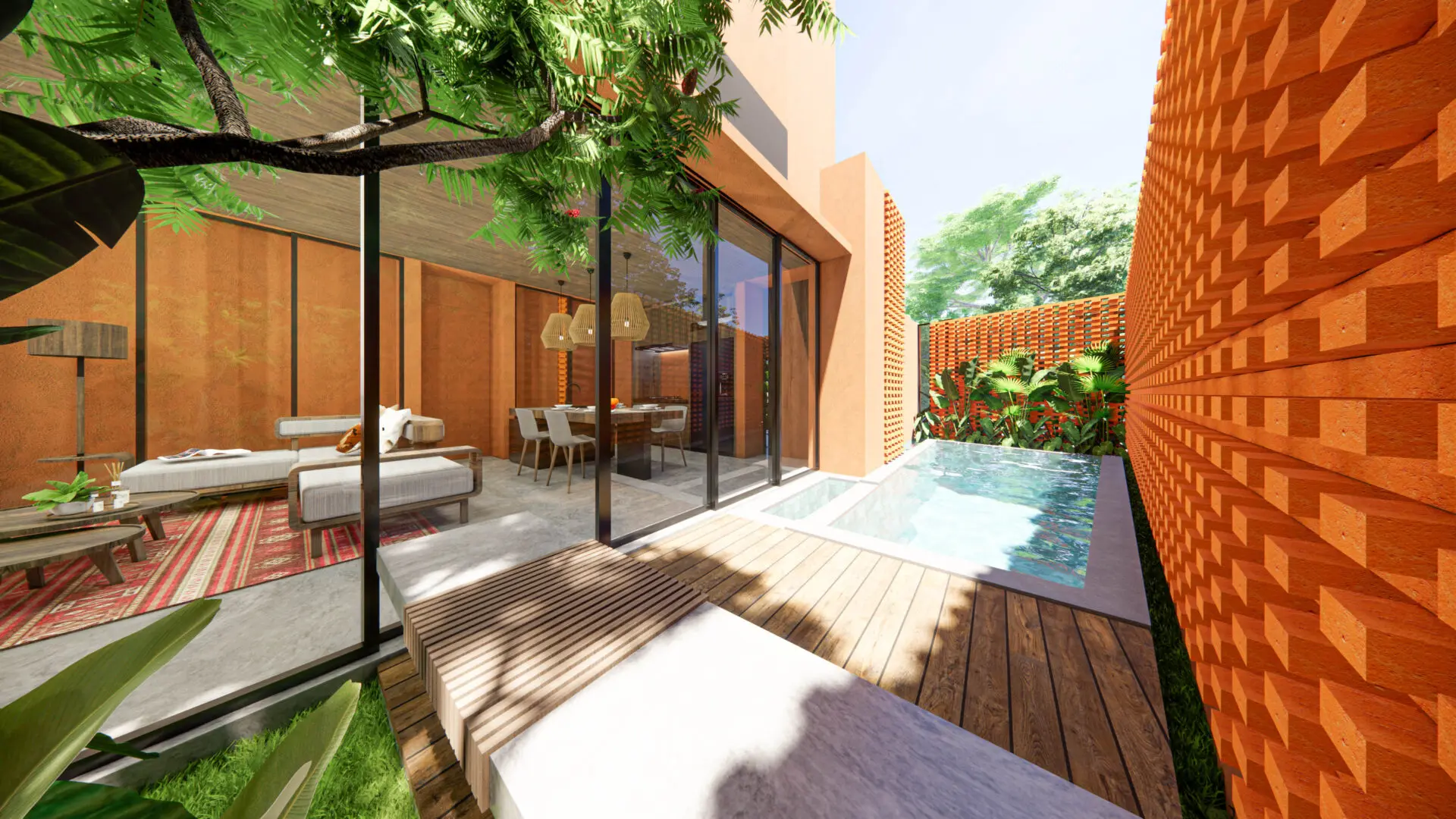 As you step into the ground floor, the open-plan layout welcomes you with a seamless flow between the living room, dining room, and kitchen, all of which provide picturesque views of the outdoors. The swimming pool, surrounded by arranged tropical plants and a charming terrace, becomes the perfect spot for relaxation. The villa features two elegant bedrooms, each offering a unique experience.