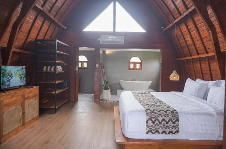The open-concept living and dining areas flow effortlessly, providing a spacious communal hub, while the fully-equipped kitchen adds practicality to the charm. With a private garden and a refreshing pool, this wooden villa is a tranquil retreat, allowing residents to immerse themselves in the serene ambiance of Canggu.