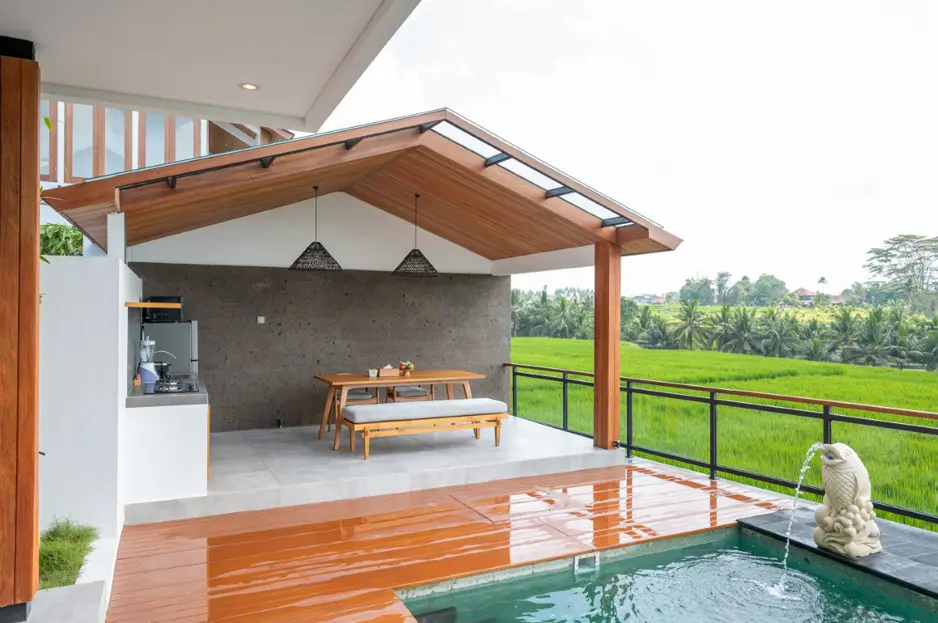 The open-plan living space seamlessly integrates with the fully-equipped kitchen, while the private pool invites residents to bask in the serenity of the surrounding landscape. Immerse yourself in the unparalleled beauty of Ubud’s nature with this wooden villa, where the stunning rice field vistas and the soothing sounds of nature become an integral part of your daily living.